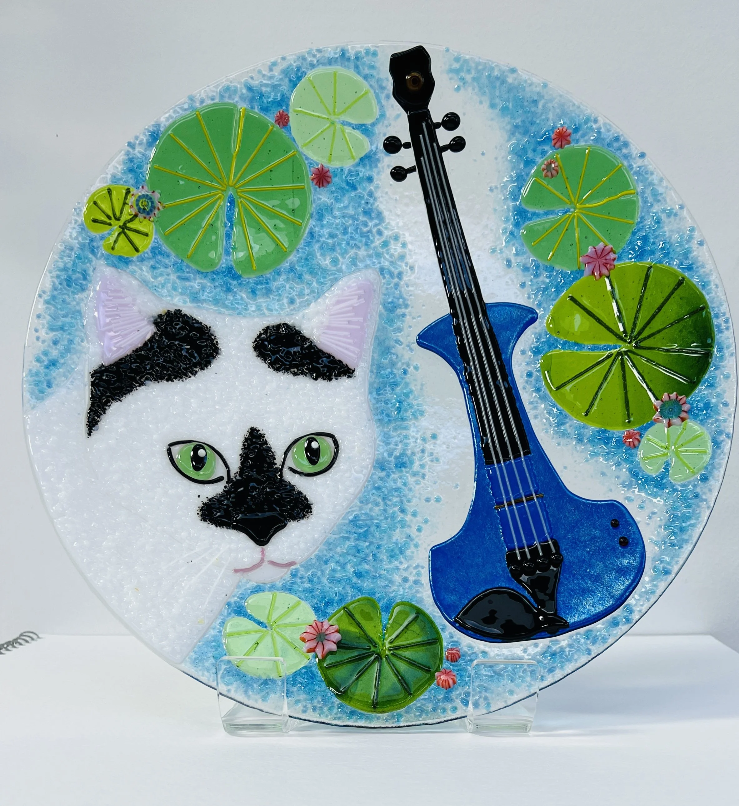 Sally created a stunning, deeply personal fused glass plate featuring an electric fiddle and a lifelike portrait of a beloved cat for a special friend..It far exceeded expectations, showcased exceptional attention to detail and Sally’s communication and craftsmanship are highly commended. I would strongly recommend Sally to anyone seeking a unique, meaningful gift.